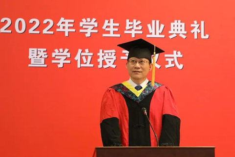 潘一山代表学校向2022届毕业生表示祝贺,并以“用心去做,无事不成”为主题寄语广大毕业生,勉励同学们不负时代,不负韶华,在青春的赛道上奋勇争先,跑出最好成绩。