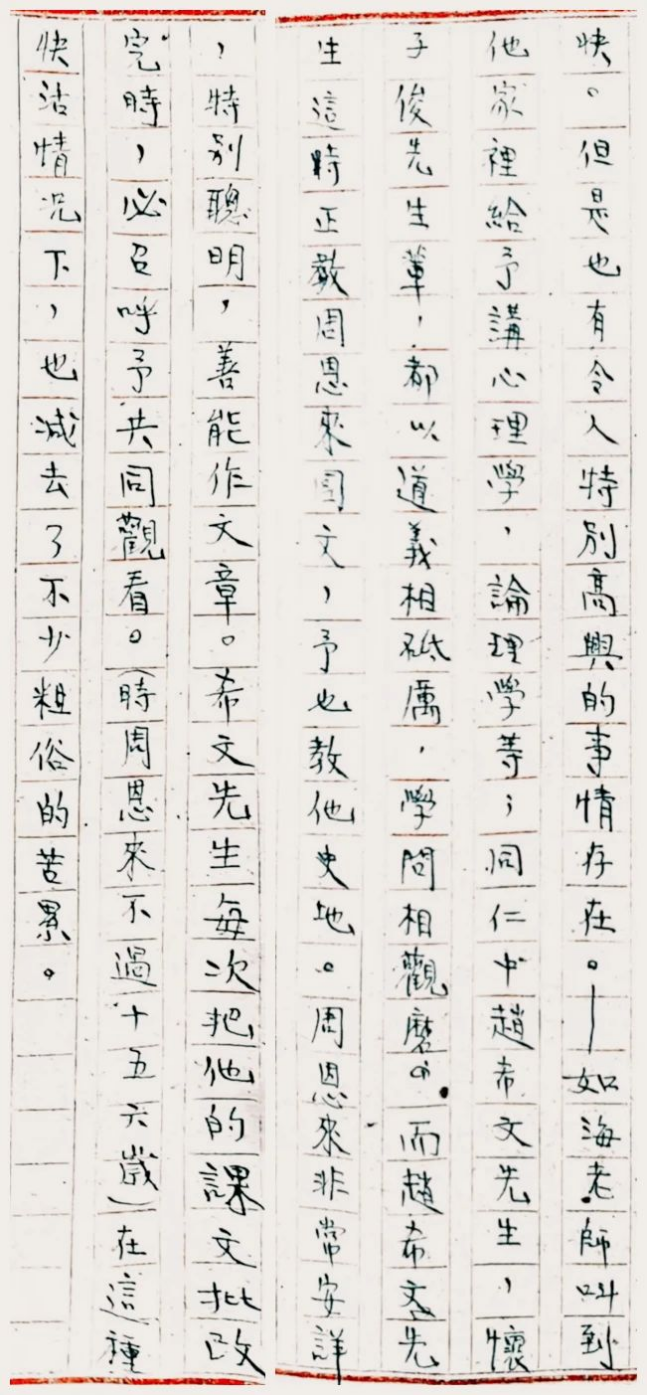 1912年,23岁的张镜玄正式走上讲台,开始在奉天省城东关第一模范小学担任国文、历史教员。他是周恩来立下“为中华之崛起而读书”宏伟志向的见证者。他在这里教了五年零六个月的书,他也是在这里见到了少年时代的周恩来。他是周恩来的史地老师,在回首这段岁月时,张镜玄称这是“令人特别高兴的事情”,他写道:“周恩来非常安详,特别聪明,善能作文章。希文先生(周恩来当时的国文老师赵希文)每次把他的课文批改完时,必招呼予共同观看。在这种快活情况下,也减去了不少粗俗的苦累。”