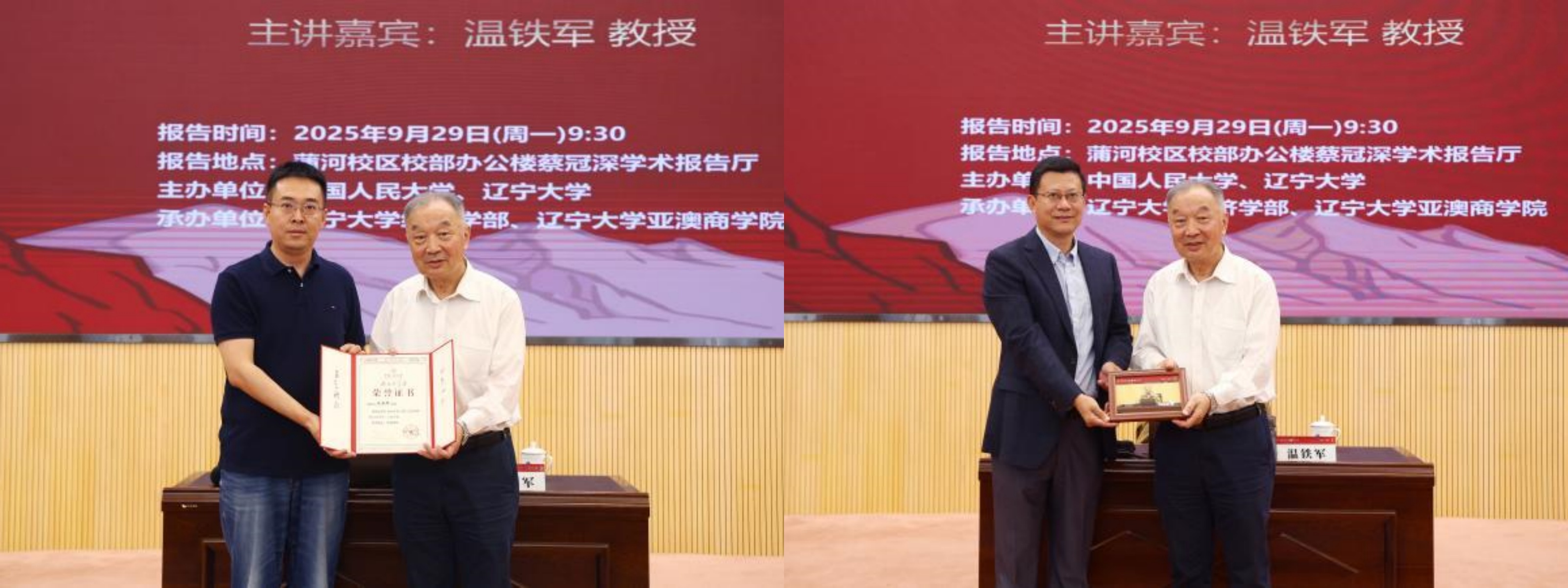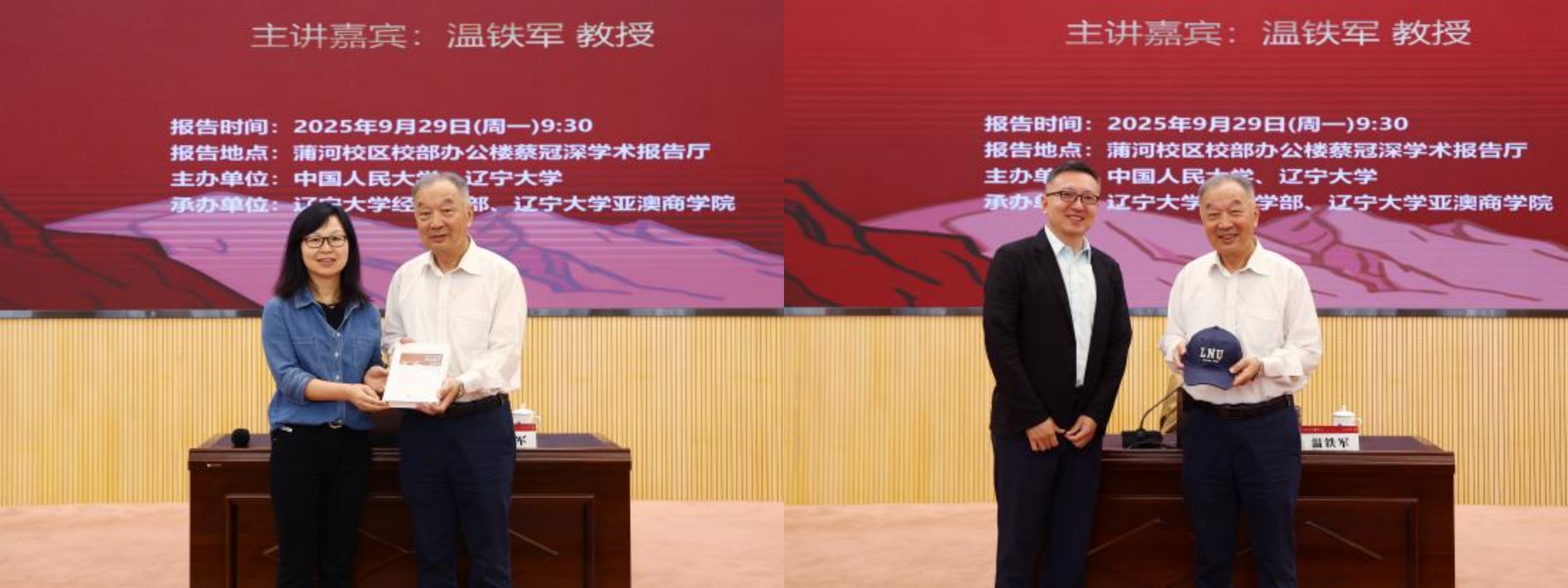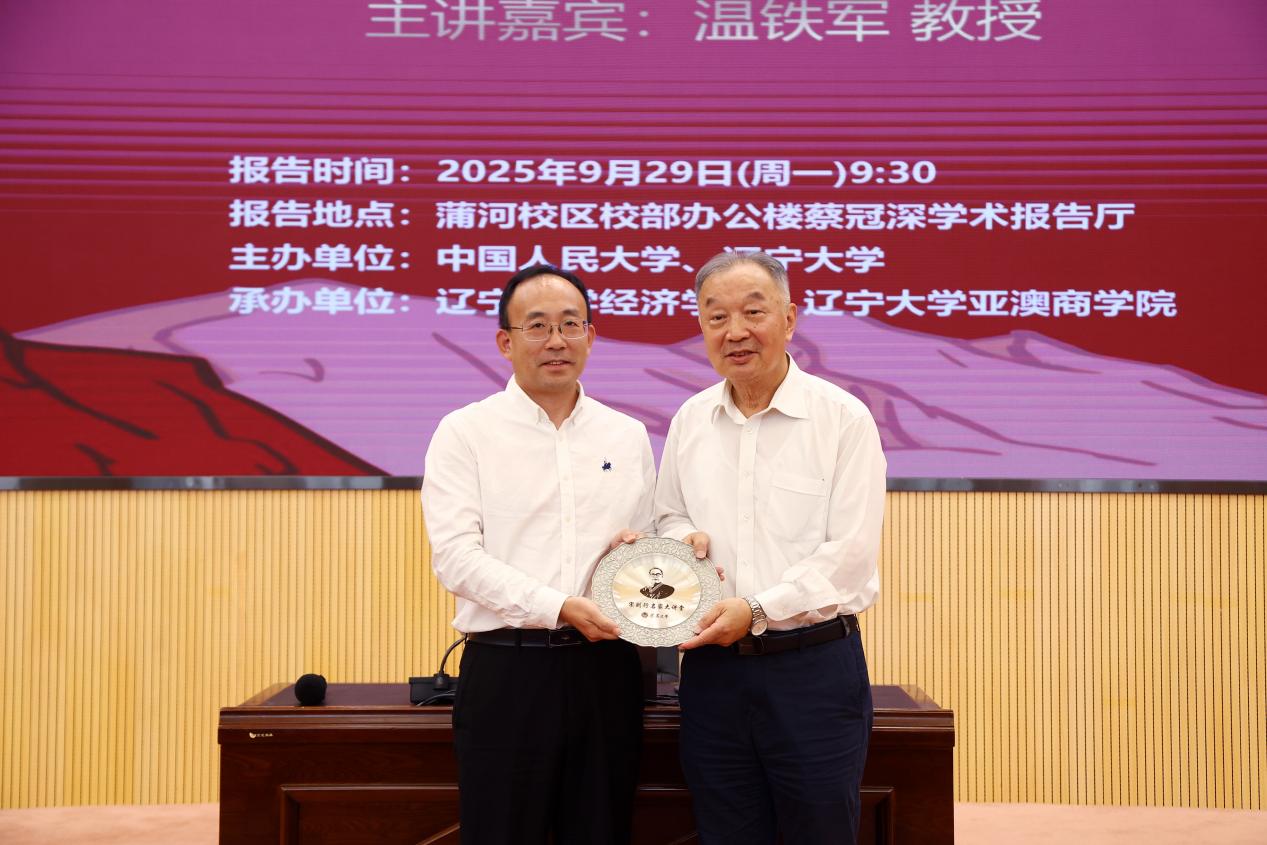报告结束后,辽宁大学副校长仇焕广为温铁军教授颁发“宋则行名家大讲堂”纪念盘,中国人民大学校友服务与资源拓展部副部长郭栋颁发“陕公大学堂”纪念证书,辽宁大学亚澳商学院院长赵德起赠送纪念照片,辽宁大学亚澳商学院副院长马亚莉赠送《辽宁大学智库报告》,辽宁大学金融与贸易学院副院长李鹏赠送校帽。