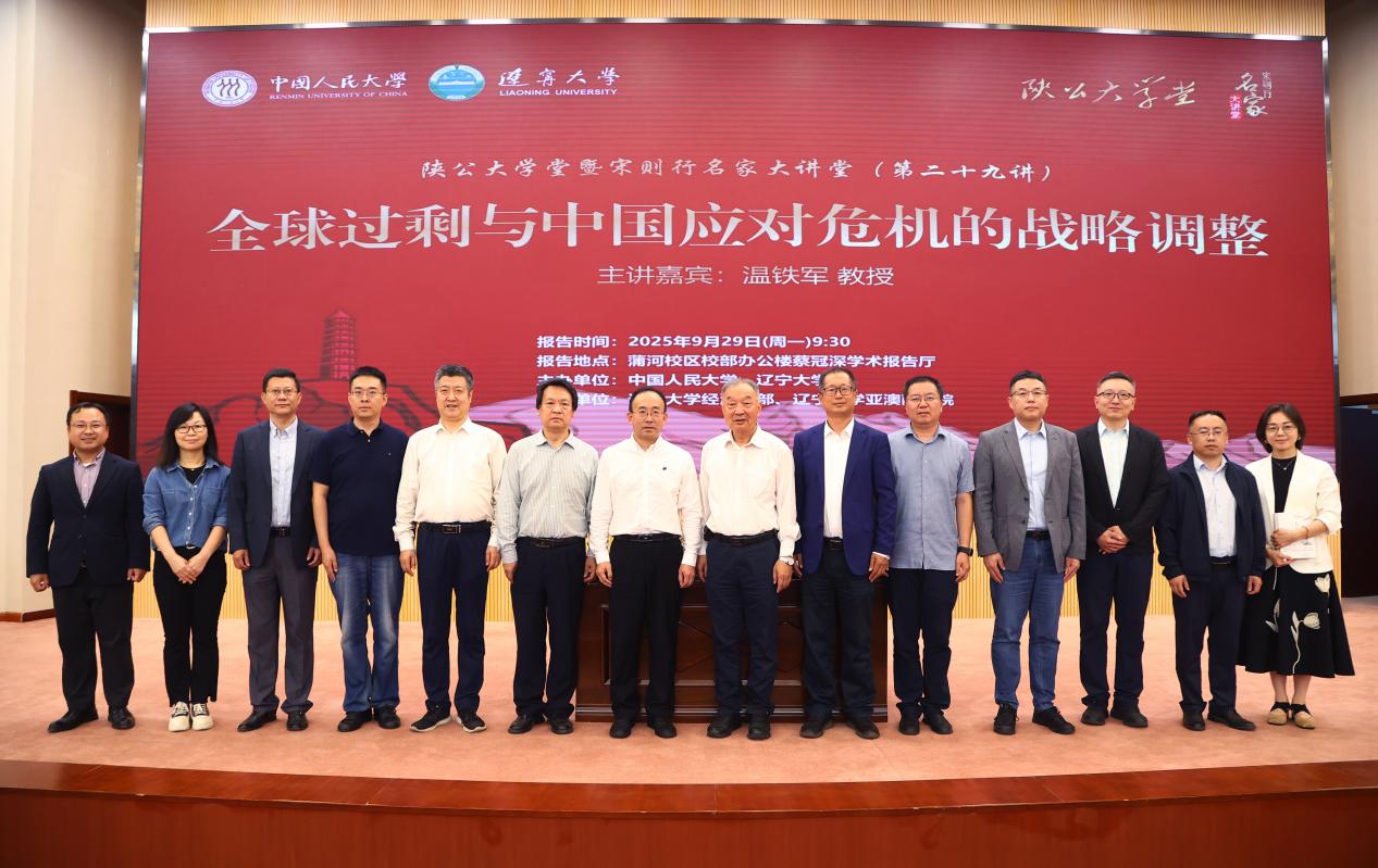 9月29日上午,“陕公大学堂”系列公益讲座(2025年第3期 )暨“宋则行名家大讲堂”(第二十九讲)在辽宁大学蔡冠深学术报告厅隆重举行。福建农林大学乡村振兴学院院长、西南大学中国乡村建设学院执行院长、中国人民大学农业与农村发展学院原院长温铁军教授应邀作了题为《全球过剩与中国应对危机的战略调整》的学术报告。第十四届全国人大代表,国际经济学会会士,辽宁大学党委副书记、校长余淼杰教授在线上致欢迎辞。辽宁大学党委常委、副校长仇焕广教授,中国人民大学校友服务与资源拓展部负责人和校友代表,辽宁大学各单位负责人和师生代表,以及来自辽宁电视台、辽宁日报的记者参加报告会。报告由经济学部副主任王伟光教授主持。