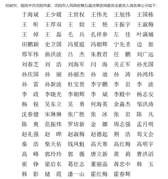 中共沈阳市委、沈阳市人民政府第五届决策咨询委员会委员汇集了长期从事城市发展、全面深化改革、产业发展、科技创新、区域协同与对外开放、城乡融合、市域治理、生态文明、法治与信用环境建设、文化强市、民生保障与社会建设、党的建设等领域专家、学者、社会各界知名人士,共同围绕全市中心工作,积极开展决策咨询、建言献策等活动,为沈阳经济社会发展提供智力支撑。
