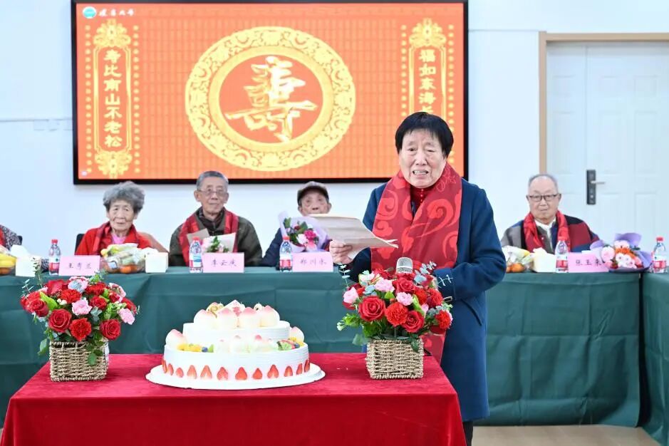 来自信息学部的青年学生代表向寿星们敬献鲜花和红围巾。寿星代表高淑莲老师发言,她对学校党委长期以来的关心与照顾表示衷心感谢,并表达了对学校发展的美好祝愿,言语中洋溢着对学校的深厚情感。