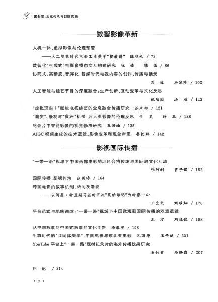 《中国影视文化传承与创新实践》中国高校影视学会第24届年会论文集出版发布。论文集由中国传媒大学出版社出版,是对学会第24届年会学术成果的总结与提升。沈国华教授担任执行主编,石竹青教授担任副主编,参与编辑出版工作。沈国华教授与博士生王子健的论文《生态时代的“共同体美学”:中国电影与东北亚电影》、石竹青教授与硕士生马洪鑫的论文《YouTube平台上“一带一路”题材纪录片的海外传播效果研究》被收录其中。