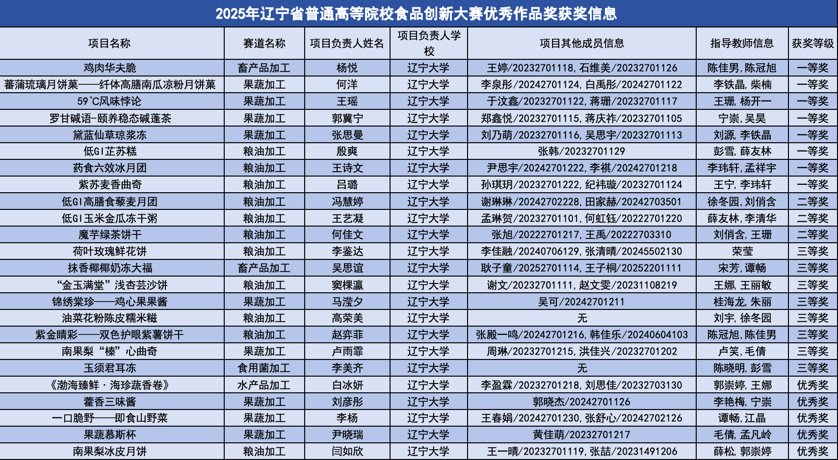 在本届大赛中,我校高度重视、积极筹备,共有53组作品参与校级选拔。经过激烈角逐与专业评审,25组作品凭借突出的创新性与实用性脱颖而出,获得代表学校征战省赛的资格。在省赛赛场的激烈比拼中,11组作品成功跻身决赛。最终,辽宁大学环境学院、药学院、商学院、经济学院、新闻与传播学院、生命科学学院、信息学部、文学院、轻型产业学院共9个学院学子协同发力,在2025年辽宁省普通高等学校本科大学生食品创新大赛中再创佳绩,共斩获省级一等奖8项、二等奖3项、三等奖8项及优秀奖5项。