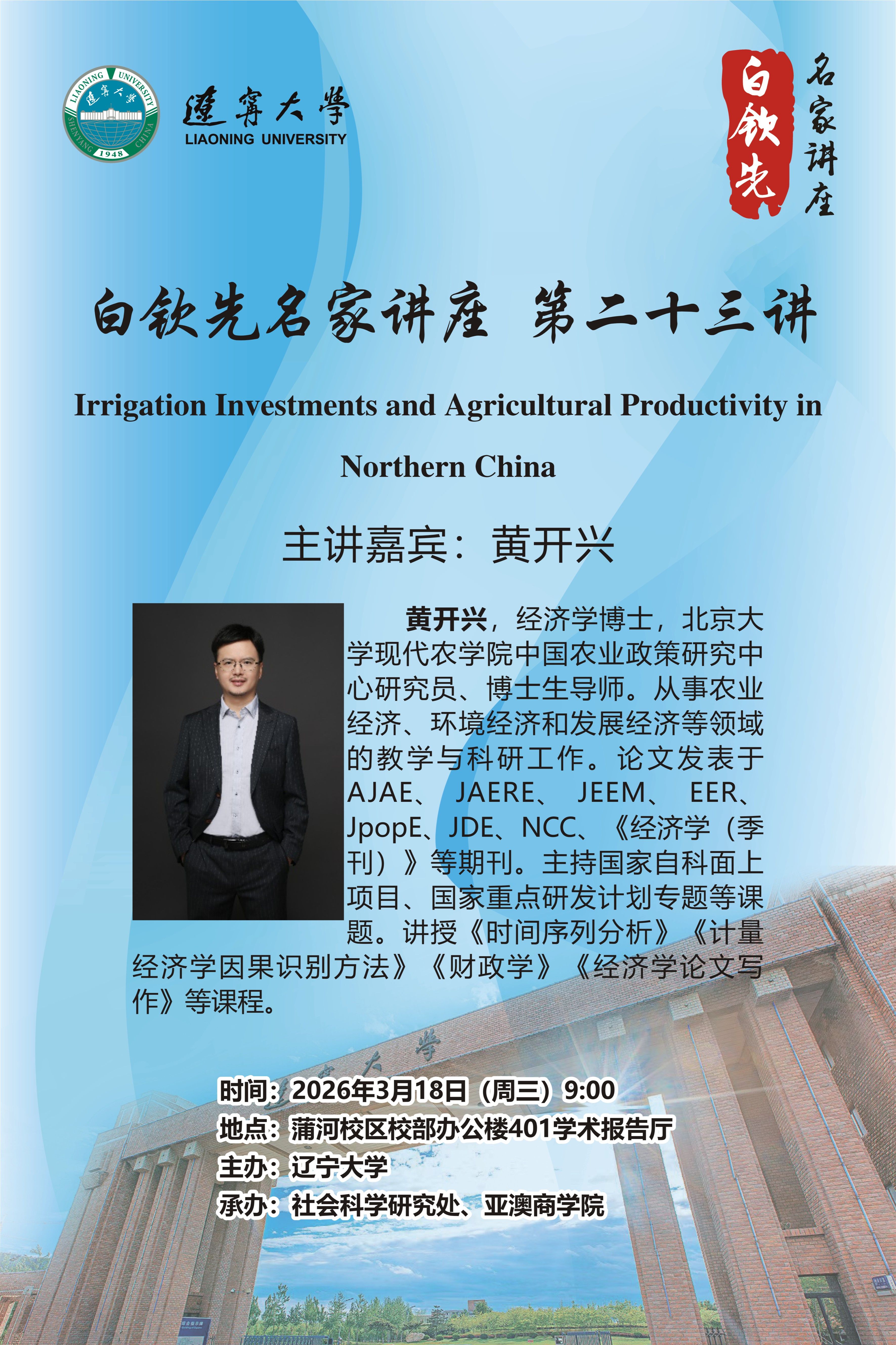 为持续建设高端学术交流平台,拓宽广大师生学术视野,学校瞄准科学发展前沿,同国际接轨,学校开设“白钦先名家讲座”,邀请国内外高学术水平经济类青年学者来校开展专题讲座。白钦先名家讲座第二十三讲将于3月18日(周三)9:00开讲,并邀请到了北京大学黄开兴研究员作为主讲嘉宾,为师生们带来题为“Irrigation Investments and Agricultural Productivity in Northern China”的学术讲座。