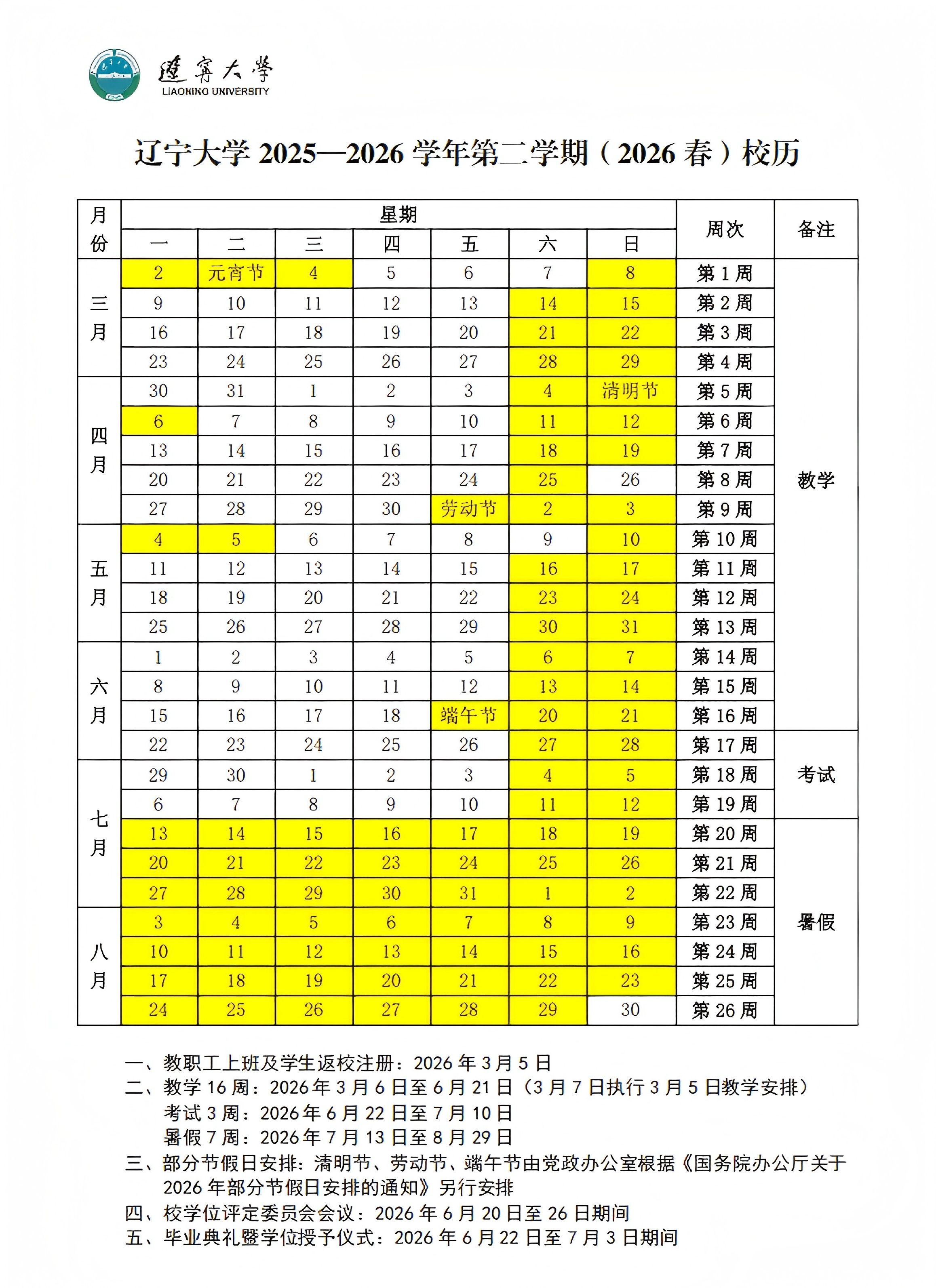 辽宁大学 2025-2026 学年第二学期(2026 春)校历
