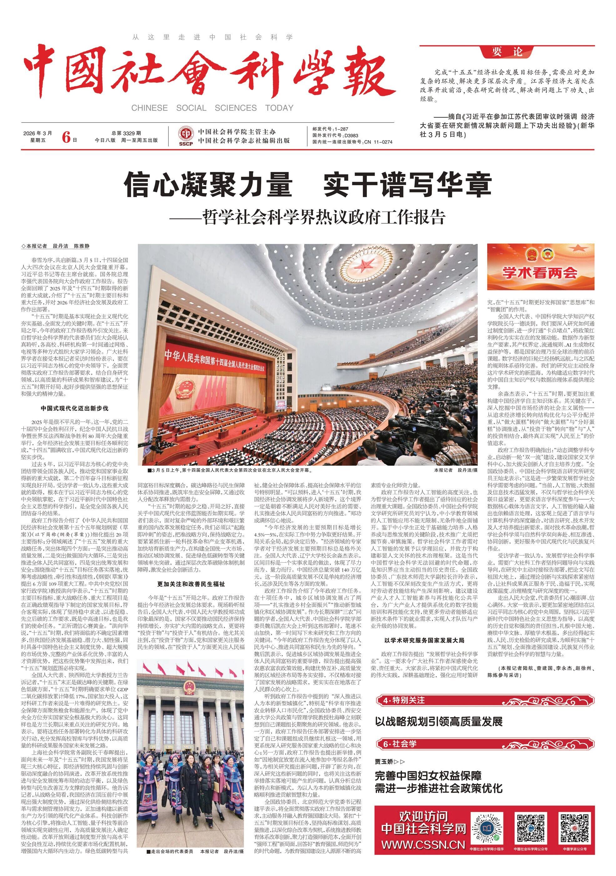 政府工作报告提出“发展哲学社会科学事业”。这一要求令广大社科工作者深感使命光荣、责任重大。大家表示,将紧扣中国式现代化的伟大实践,深耕基础理论,强化应用对策研究,在“十五五”时期更好发挥国家“思想库”和“智囊团”的作用。