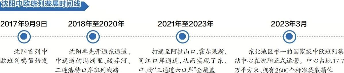 为抢抓发展机遇,2017年9月9日,沈阳首列中欧班列鸣笛始发。2023年3月,集结中心正式投运,初期规划年均开行500列。