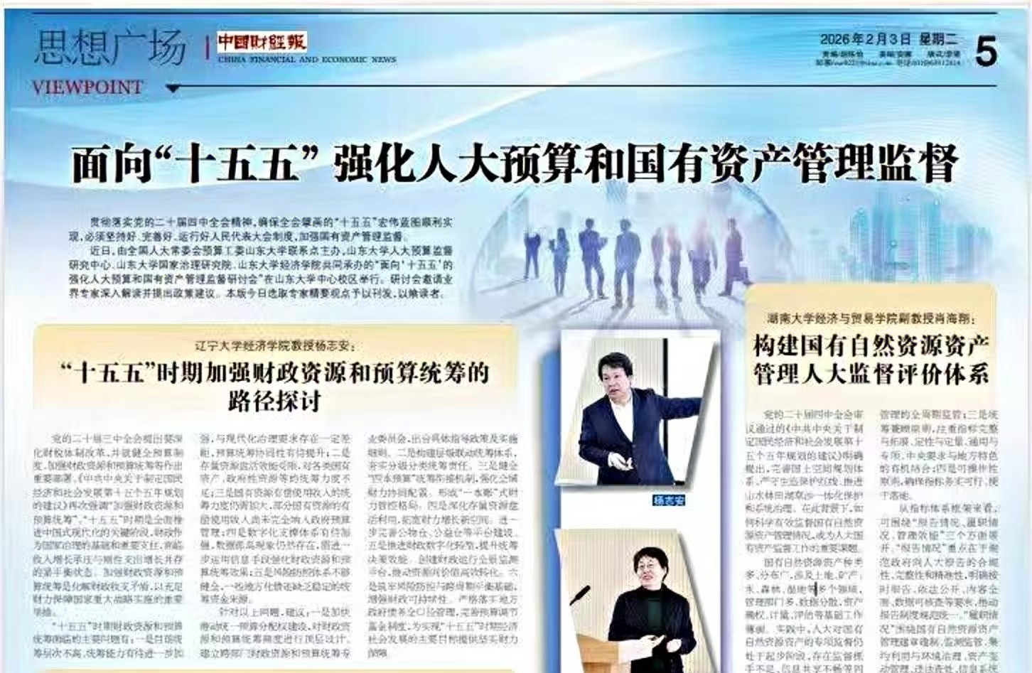 《中国财政报》思想广场栏目以“面向‘十五五’强化人大预算和国有资产管理监督”为题,指出落实党的二十届四中全会精神,确保全会擘画的“十五五”宏伟蓝图顺利实现,必须坚持好,完善好,运行好人民代表大会制度,加强国有资产管理监督的重要性。近日,由全国人大常委会预算工委山东大学联系点主办,山东大学人大预算监督研究中心、山东大学国家治理研究院、山东大学经济学院共同承办的“面向十五五的强化人大预算和国有资产管理监督研讨会”在山东大学中心校区举行,研讨会邀请业界专家深入解读并提出政策建议。
