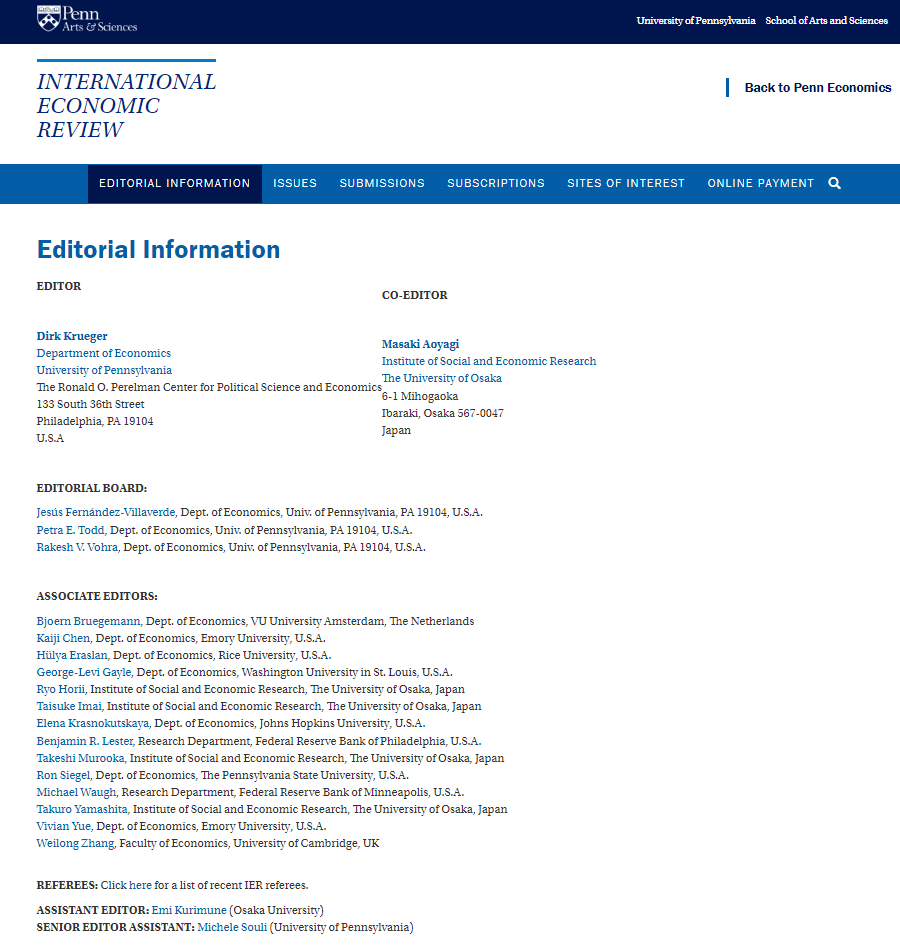 International Economic Review(IER)创刊于1960年,由宾夕法尼亚大学主办,全球知名出版机构Wiley-Blackwell出版,是经济学领域的综合性顶级期刊。
